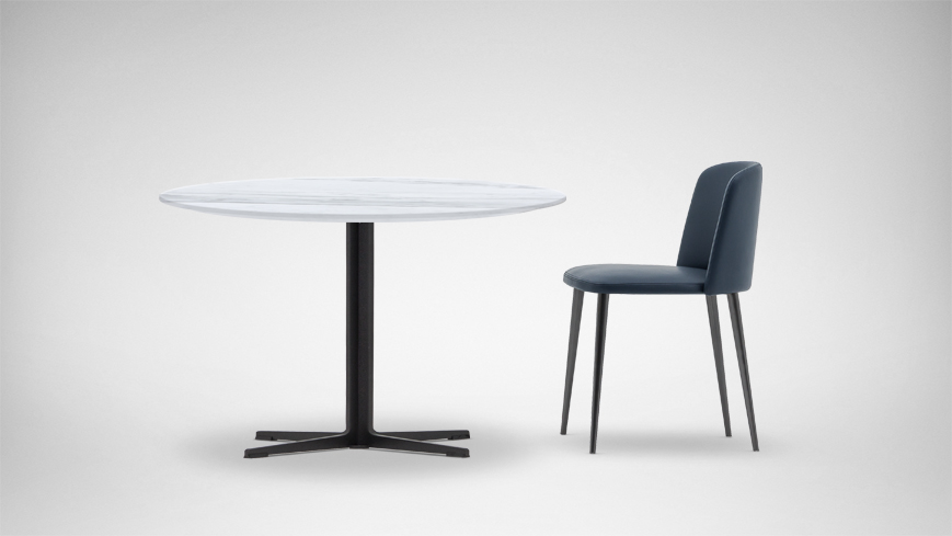 Vary es una mesa de diseño contemporáneo, elegante y versátil. Las patas de líneas rectas son de acero grafito y la base puede ser en mármol o de madera sólida enchapada en madera de Nogal. Este modelo de mesas tiene muchos tamaños para poder combinarlos en el living y comedor.